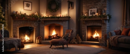 Cozy reading nook near a warm and crackling fireplace on Christmas Eve, comfy chair, holiday cheer, quiet evening