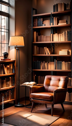 Cozy reading nook with a leather sofa and lamp surrounded by wooden bookshelves in warm light through glass window, interior home decoration design concept