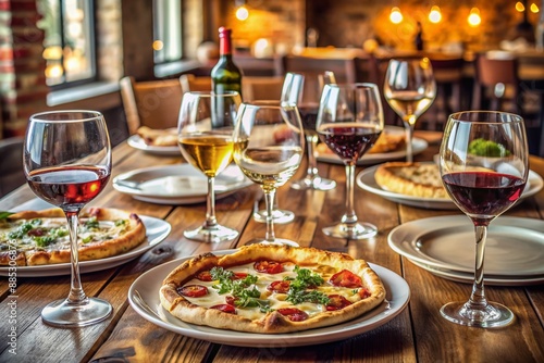 Cozy restaurant table setting with delicious pizza, glasses of red and white wine, and empty plates, awaiting a joyful gathering of friends to share a meal.