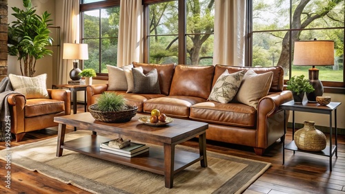 Cozy Retreat Warm Beige Leather Sofa Plush Throw Pillows Rich Walnut Coffee Table Soft Morning Light Rustic Accents Intimate Ambient Space