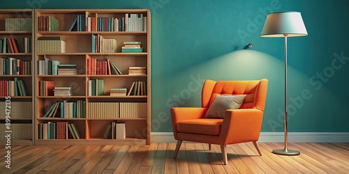 Cozy room with orange chair, bookshelves, lamp, and tea table with cartoonish background, cozy, room, orange chair