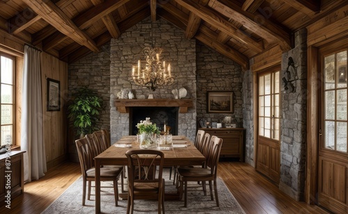 Cozy rustic farmhouse dining room with wooden beams, vintage furniture, and potted herbs