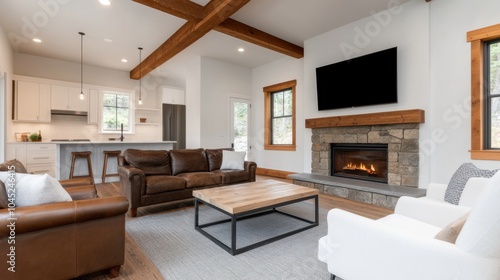 rustic, living, room, stone, fireplace, leather, couch, hot drink, table, wood, beam, window, plant, decor, comfortable, roomy, modern, bright, inviting, natural, light, design, furnishing, seating, home, contemporary, architecture, atmosphere, style, interior, arrangement, warmth, elegance, relaxing, aesthetic, colours, texture, cosy, ambience, furniture, environment, charme, simplicity, decoration