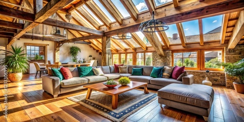 Cozy Rustic Loft Interior with Natural Light, Exposed Beams, and Comfortable Seating, Perfect for Minimalist Photography Inspiration