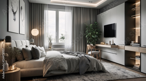 Cozy Scandinavian bedroom featuring neutral furniture large bed mirror lamp and tranquil nature views visible from the window Modern Interior Design Inspiration