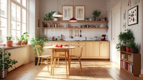 Cozy Scandinavian kitchen D render featuring light wooden cabinetry, white tile backsplash, and festive red accents