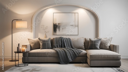 sofa, sectional, pillow, throw, blanket, candle, lamp, modern, interior, design, living, room, comfortable, neutral, colours, home, decor, ambience, relaxation, elegant, stylish, contemporary, furniture, art, wall, cosy, inviting, warm, lighting, soft, texture
