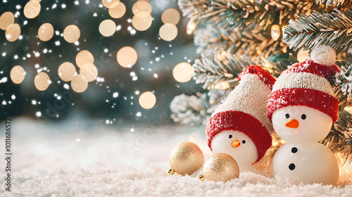 Cozy snowmen under Christmas tree create festive atmosphere, surrounded by sparkling lights and soft snow. scene evokes warmth and holiday cheer