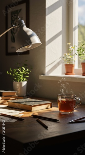 cosy, sunlit, workspace, tea, book, plant, office, tranquil, home, desk, light, window, morning, warm, relaxation, peaceful, study, sunlight, corner, wooden, table, atmosphere, serene, stationery, lamp, work, environment, interior, natural, decor, greenery, refreshing, mug, cup, notebook, writing, comforting, inviting, homely, calm, contemplation
