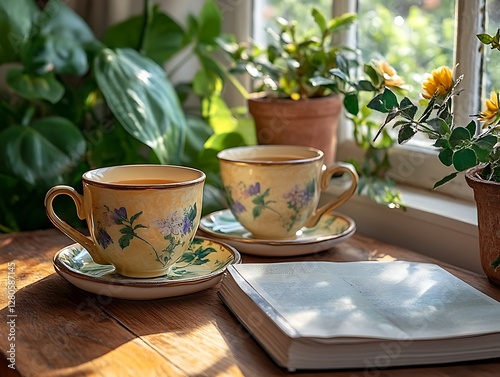 Cozy teacups, window seat, reading book, sunlit interior