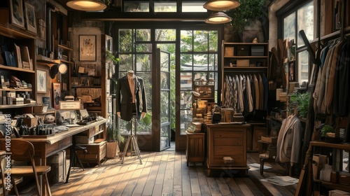 tailoring, vintage, shop, interior, wooden, floor, clothing, display, warm, lighting, urban, cosy, sewing, craftsmanship, design, fashion, decor, ambience, workspace, creativity, accessory, nature, furniture, workshop, hand-made, textile, material, style, artistry, boutique, elegant, shelf, window, relaxation, inviting, artisanal, plant, seasonal, atmosphere, tool, aesthetic, environment, character