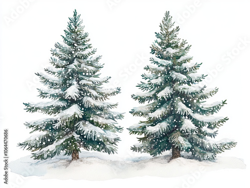 cozy watercolor style scene featuring two snow covered pine trees, surrounded by serene winter landscape. gentle snowfall adds peaceful touch to this woodland setting