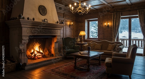 Cozy Winter Chalet Interior with Fireplace and Mountain View
