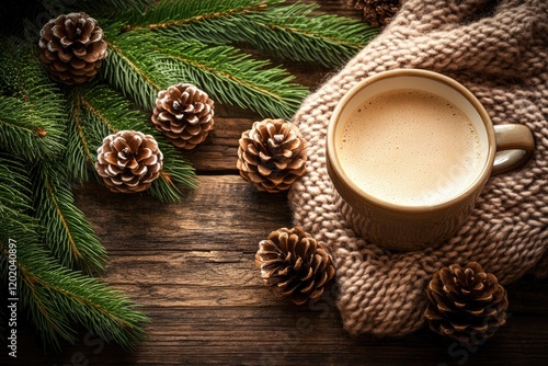 Cozy winter coffee on wooden table with pine cones and branches