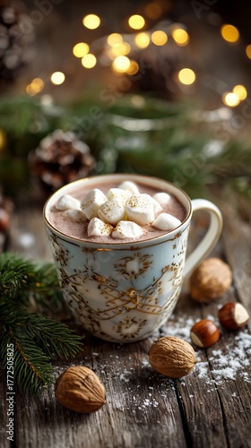 Cozy winter evening hot chocolate with marshmallows in elegant vintage mug, surrounded by festive pine branches and soft glowing lights