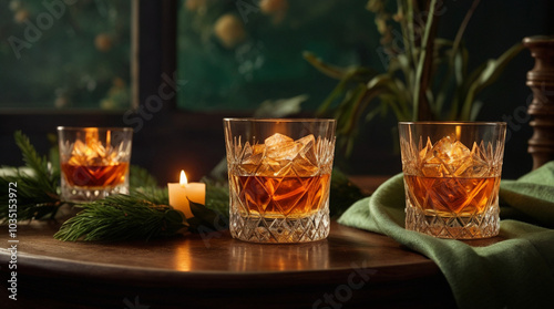 Cozy winter holidays scene with richly aromatic spiced whiskey in a crystal glass on a wooden table. The Old Fashioned cocktail.