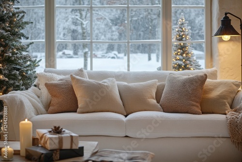 Cozy Winter Living Room with Holiday Decorations and Snowy View