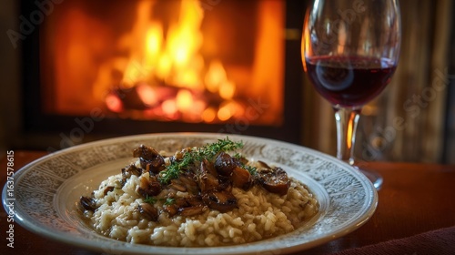 Cozy winter meal of creamy mushroom risotto paired with a warming glass of Merlot near a crackling fireplace