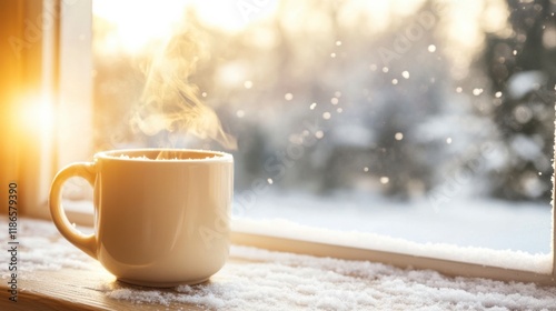 Cozy Winter Morning: A steaming mug of coffee sits on a snowy windowsill, sunlight streaming through the frosted pane. The warmth of the drink contrasts with the wintery scene outside.