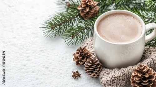 Cozy winter scene featuring a mug of hot chocolate with pine cones and snow.
