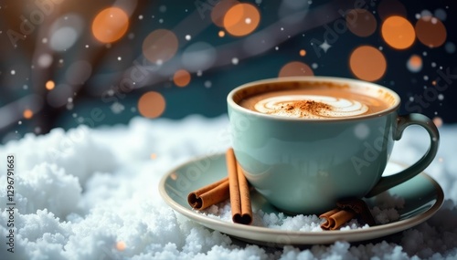 Cozy winter scene of a mug with hot chocolate and cinnamon sticks on a snowy table, snow, still, winter