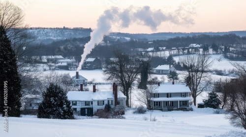 winter, snow, house, smoke, landscape, tree, rural, village, cold, atmosphere, environment, serene, peaceful, scenery, nature, countryside, chimney, frost, daylight, quiet, beauty, white, season, weather, hill, glacé, chilly, scenic, residential, small town, calmness, evening, sunlight, clear sky, winter landscape, idylli, pastoral, charming, picturesque, calm, snow-covered, frost-bitten, warmth, cosy