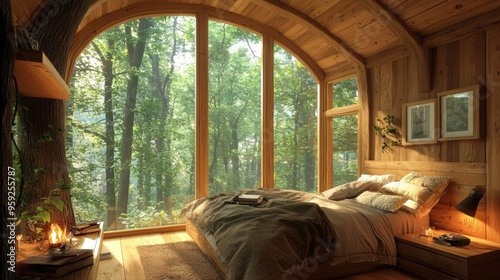 Cozy Wooden Cabin Bedroom Overlooking Lush Forest Landscape