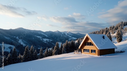 Cozy Wooden Cabin on Snowy Landscape Surrounded by Mountains