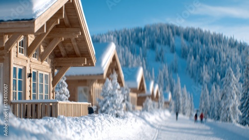 Cozy wooden chalets in snowy alpine resort on a sunny winter day with pine trees and blue sky
