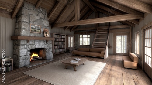Cozy wooden living room with a fireplace, bookshelves, and natural light.