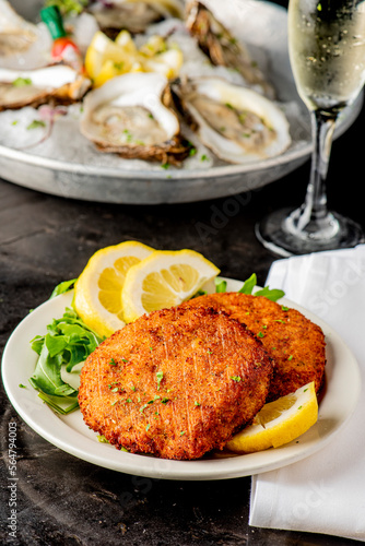 Crab cake. Crab cake served with spicy rémoulade sauce on top of a mixed green salad. Jumbo crab meat mixed with garlic, onions, spices and fried in butter. Classic American restaurant appetizer.