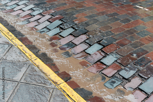 authentic, diagonal, pattern, cobbled, pavement, cuzco, peru, stone, colours, yellow, blue, line, rough, real, puddle, wet, severe, city, urban, background, damaged, road, way