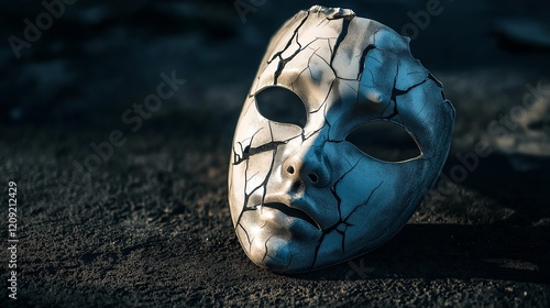 mask, cracked, metallic, silver, texture, dark, dramatic, broken, mystery, concept, identity, emotional, artistic, solitude, symbolic, design, abandoned, eerie, surreal, abstract, sorrowful, sculpture, loneliness, theatre, shadow, forgotten, tragedy, creativity, unique, contrast, despair, resilience, modern, no people, dark background