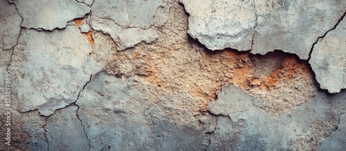 Cracked weathered concrete wall texture with peeling paint and exposed underlying layers Copy Space