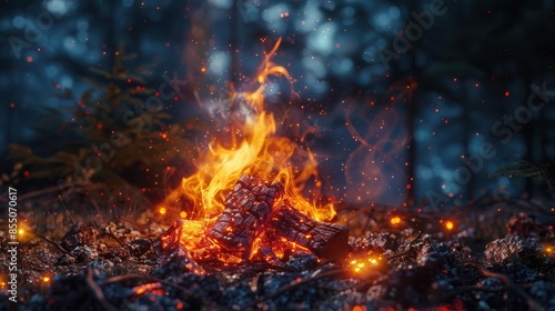 crackling campfire with glowing embers and wisps of smoke realistic 3d render