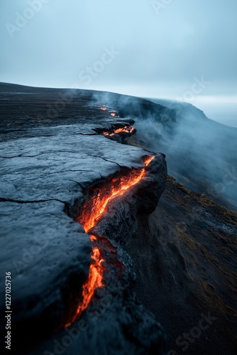 lava, volcano, crack, earth, mist, landscape, scenery, active, glowing, terrain, nature, geology, eruption, heat, steam, environment, wilderness, underground, magma, mysterious, dramatic, picturesque, adventure, exploration, natural phenomenon, captivating, wild, scenic, hazardous, cooling, rock formation, dark, mineral, rugged, aethereal, geothermal, stunning, beauty, ancient, solitude, serenity, atmospheric