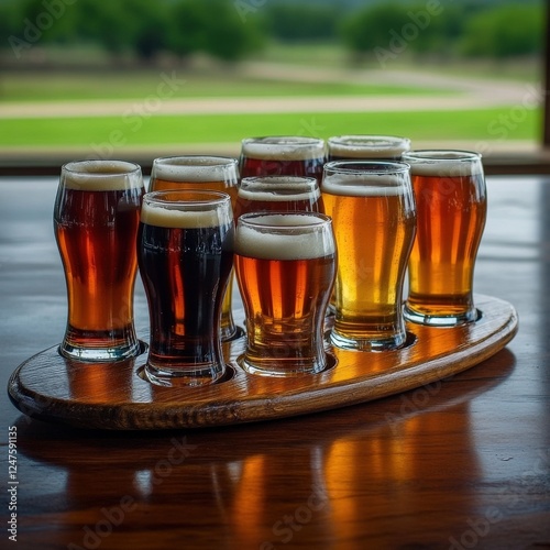 Craft Beer Flights Sampler on Wooden Paddle Overlooking Scenic Green Landscape through Window in Brewery or Bar Setting Tasting Experience with Assorted Glasses