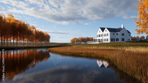 house, lake, foliage, charming, white, overlook, serene, surround, autumn, blue, stunning, river, climate, project, rural, software, concept, garden, feature, client, bungalow, nature, realism, journey, design, fall, sunset, texture, teamwork, landscape, colours, detail, home, shelter, view, showcase, tree, panel, scenic