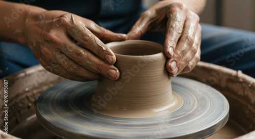 potter, hand, clay, wheel, pottery, shaping, spinning, ceramic, brown, muddy, art, artist, craft, tool, making, studio, workshop, skill, artwork, material, creative, hand-made, artisan, hobby, design, sculpture, traditional, process, equipment, technique, closeup, indoor, sharpened, natural, soft, light, working, creating, circular, table, blue, clothing, artistic, mood, lifestyle, education
