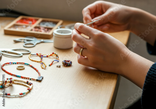 Crafting handmade jewelry with colorful beads and unique designs in a cozy workspace