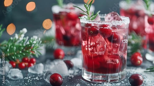 Cranberry cocktail with ice christmas cranberry beverage in glasses decorated with sugar and rosemary