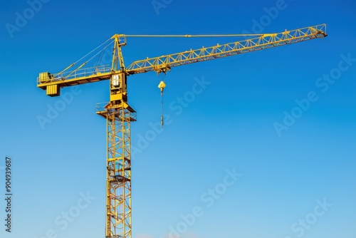 Crane in Yellow. Towering Over Urban Construction Site with Blue Sky