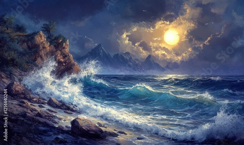 wave, sea, water, ocean, sky, nature, blue, seascape, landscape, horizon, dark, canvas, foam, splash, wind, art, beach, weather, summer, artist, background, storm, stormy, painting, travel, crashing, wave, rocky, shore, night, rugged, coastline, spray
