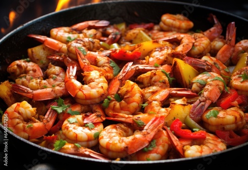Crawfish boils. Louisiana, New Orleans Crawfish Boil. Spicy shrimp boil. Shrimp, lobster, seafood, sausage, on the pan.