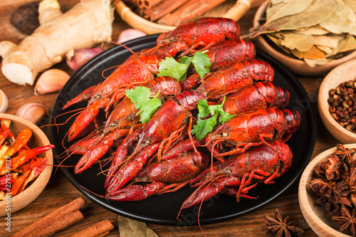 Crayfish. Red boiled crawfishes on table in rustic style, Lobster closeup.