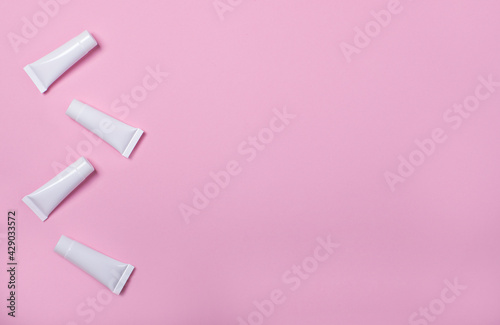 Cream tube mock up isolated on pink set of four white blank cream jars
