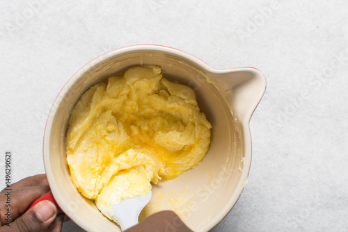Creaming butter sugar and egg with a spatula, the process of making a cake and cookies, mixing butter and sugar to make a cake and cookies