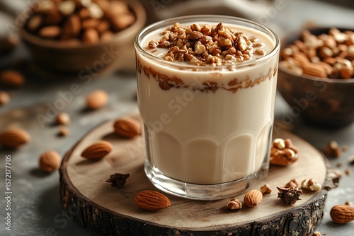 Creamy Almond Milk Drink with Toasted Nuts, Served on Wooden Sur