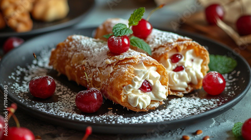 Creamy and crispy cannoli, delicious Sicilian pastry with snow sugar and cherries, garnished with green mint leaves. Homemade food.