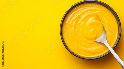 Creamy butternut squash soup recipe kitchen food photography bright yellow background close-up view comforting dish